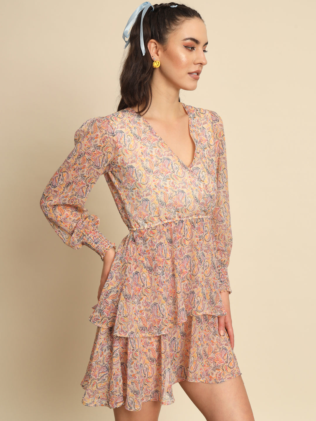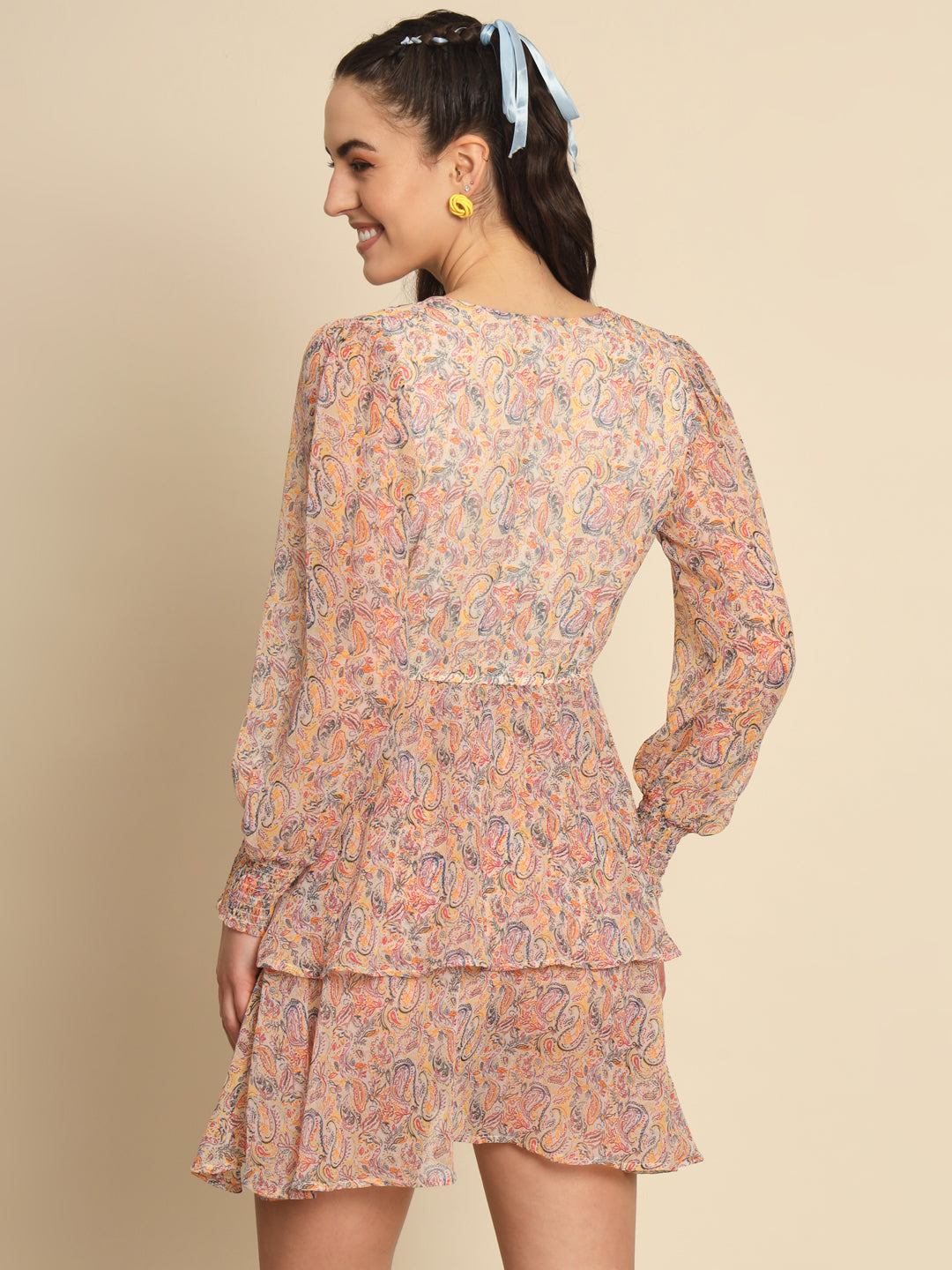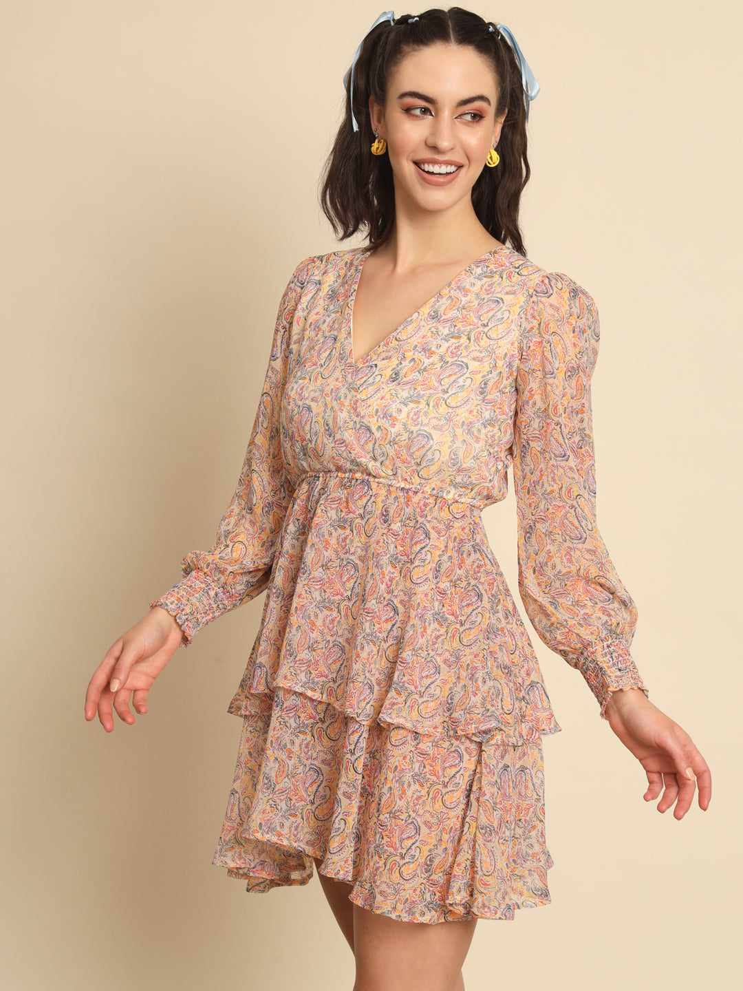 Beige Paisley Printed Overlap Dress