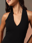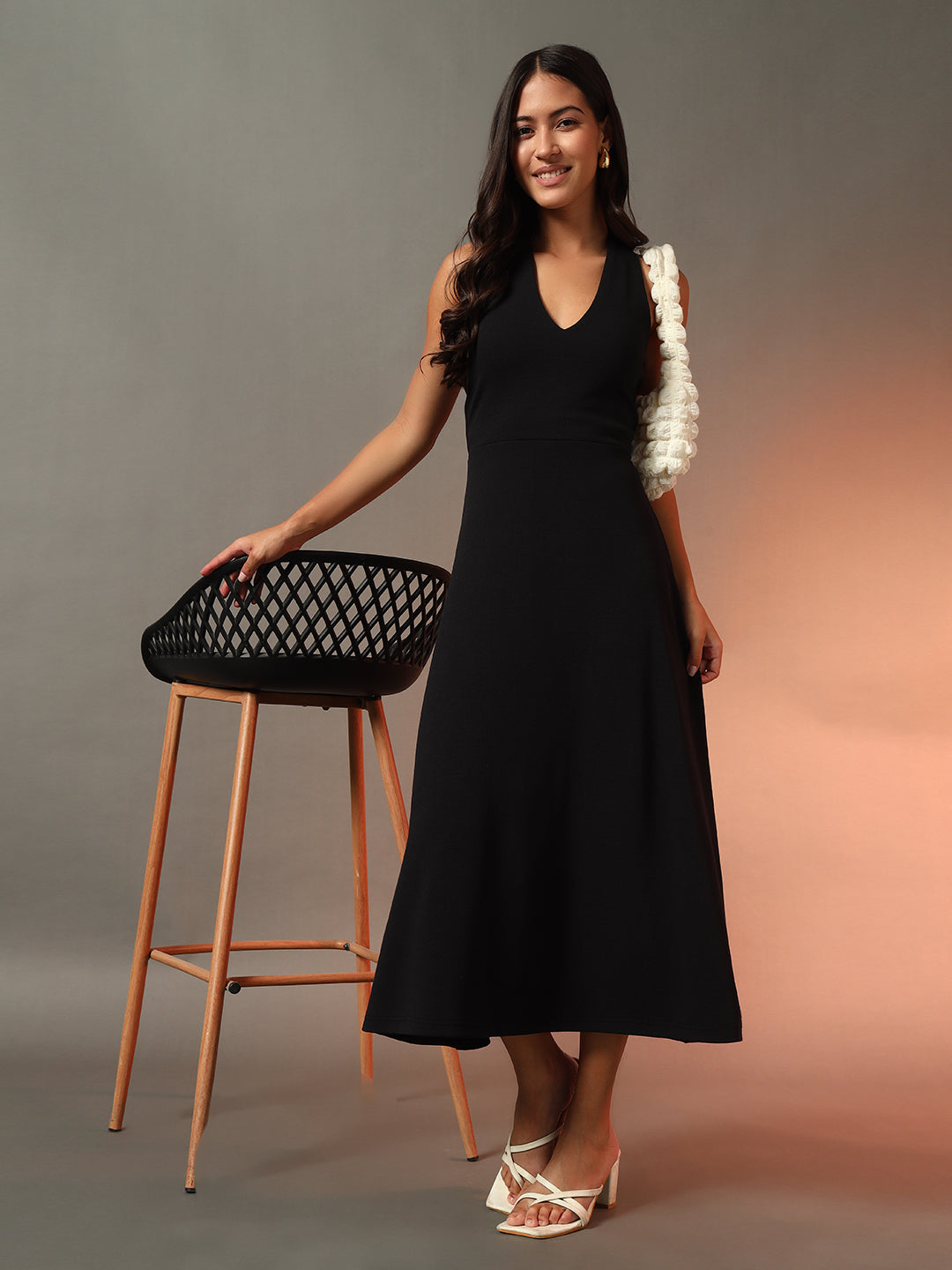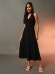 A halter neck fit & flare midi dress showcases a graceful neckline, fitted bodice, It flatters the silhouette, offering a chic, feminine look ideal for any occasion.