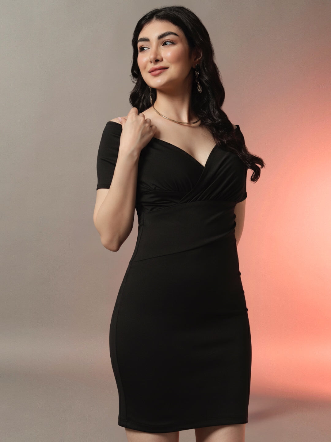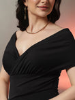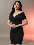 ?? Elegance Meets Modern Glamour! Make a stunning impression in this black off-shoulder mini dress featuring a sophisticated V-neck and flattering ruched details. The off-shoulder design with short sleeves creates a romantic silhouette, while the wrapped front and bodycon fit enhance your curves beautifully.