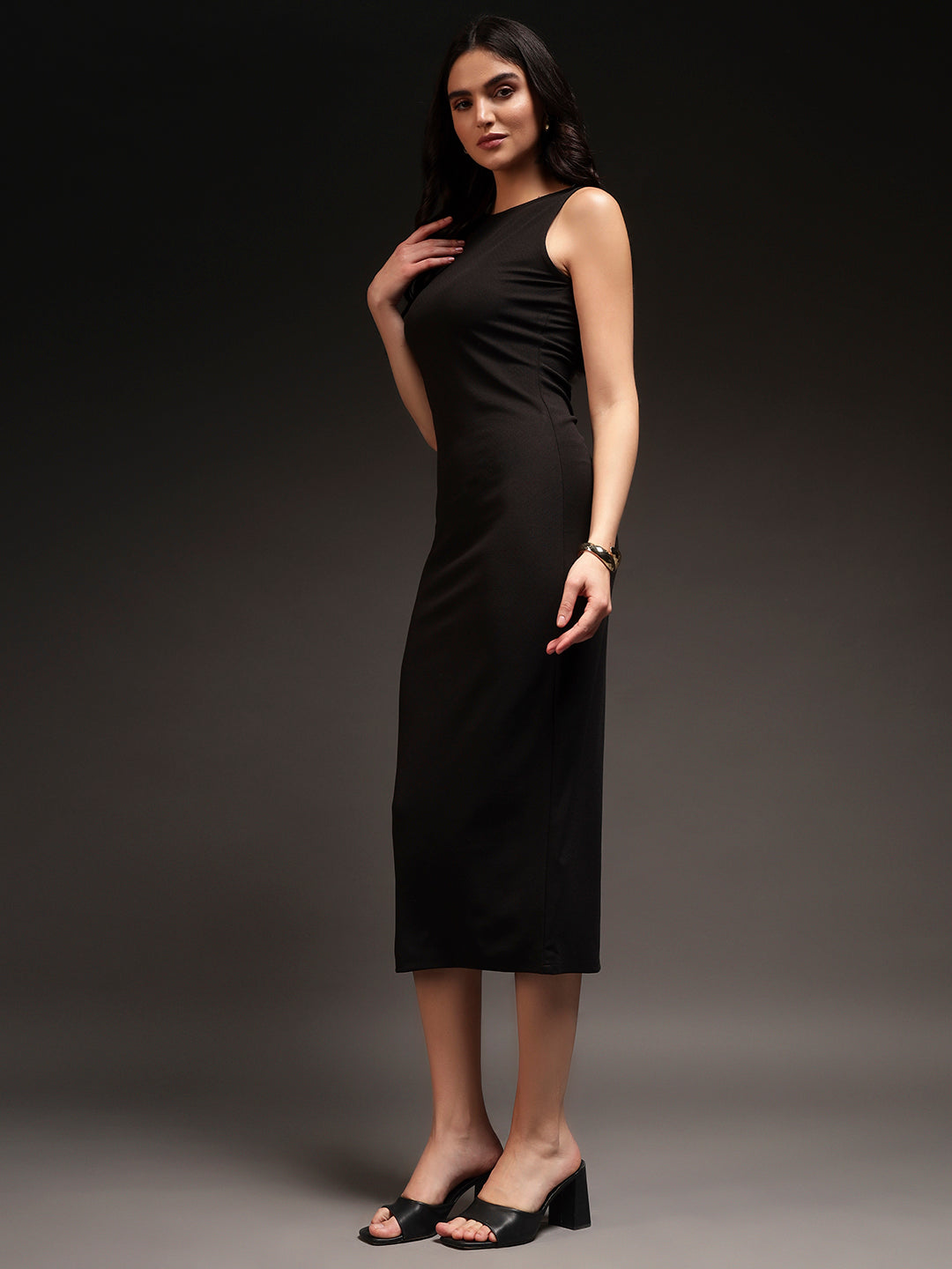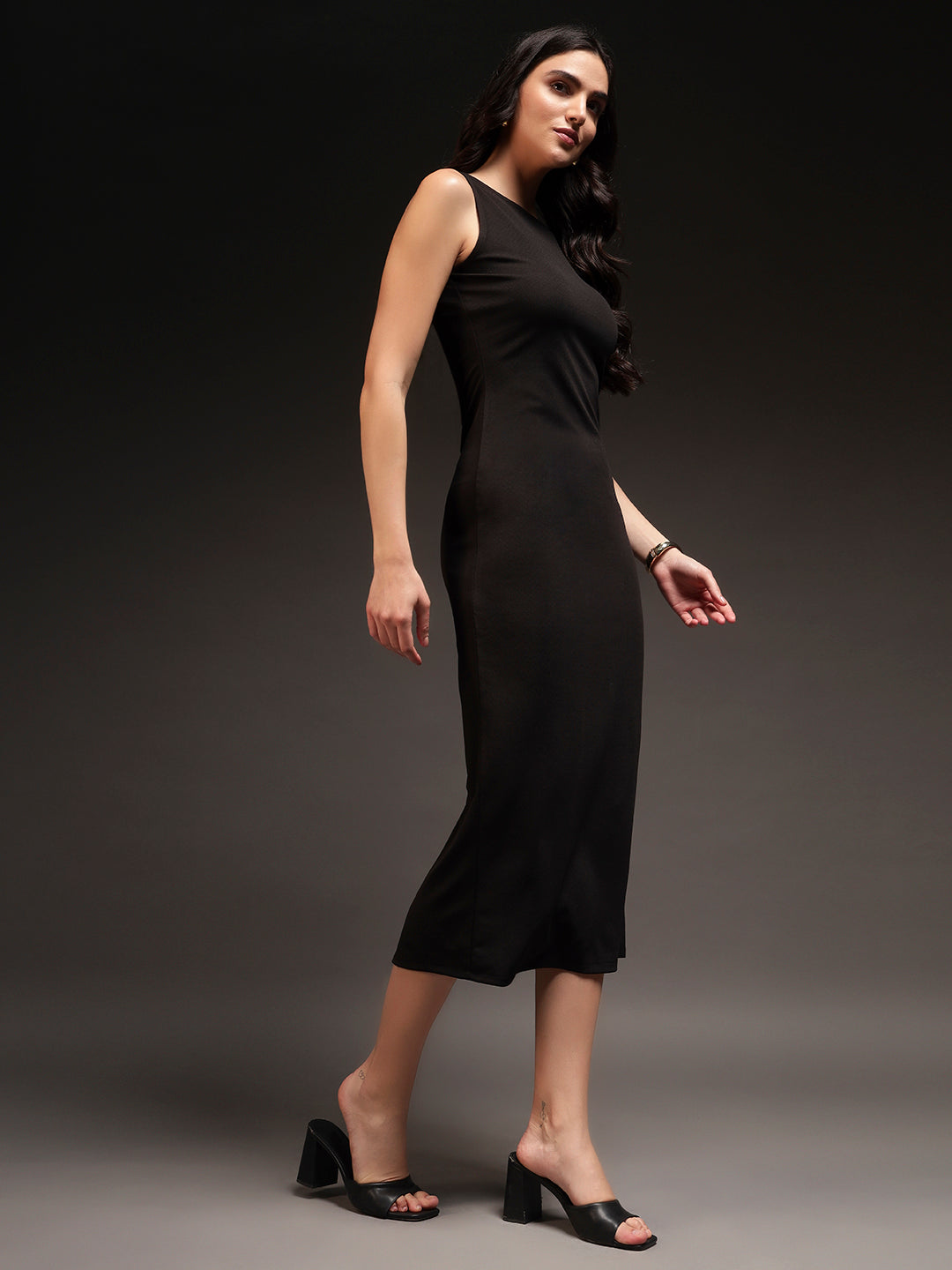 Timeless Sophistication Meets Comfort! Make an unforgettable impression with this classic black midi dress. Designed in soft, luxe rayon, this bodycon style hugs your curves effortlessly and flatters every silhouette. The sleeveless design, crew neckline, and stylish midi length add a touch of sophistication, while the back slit provides ease of movement and a subtle, sexy detail.