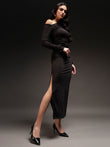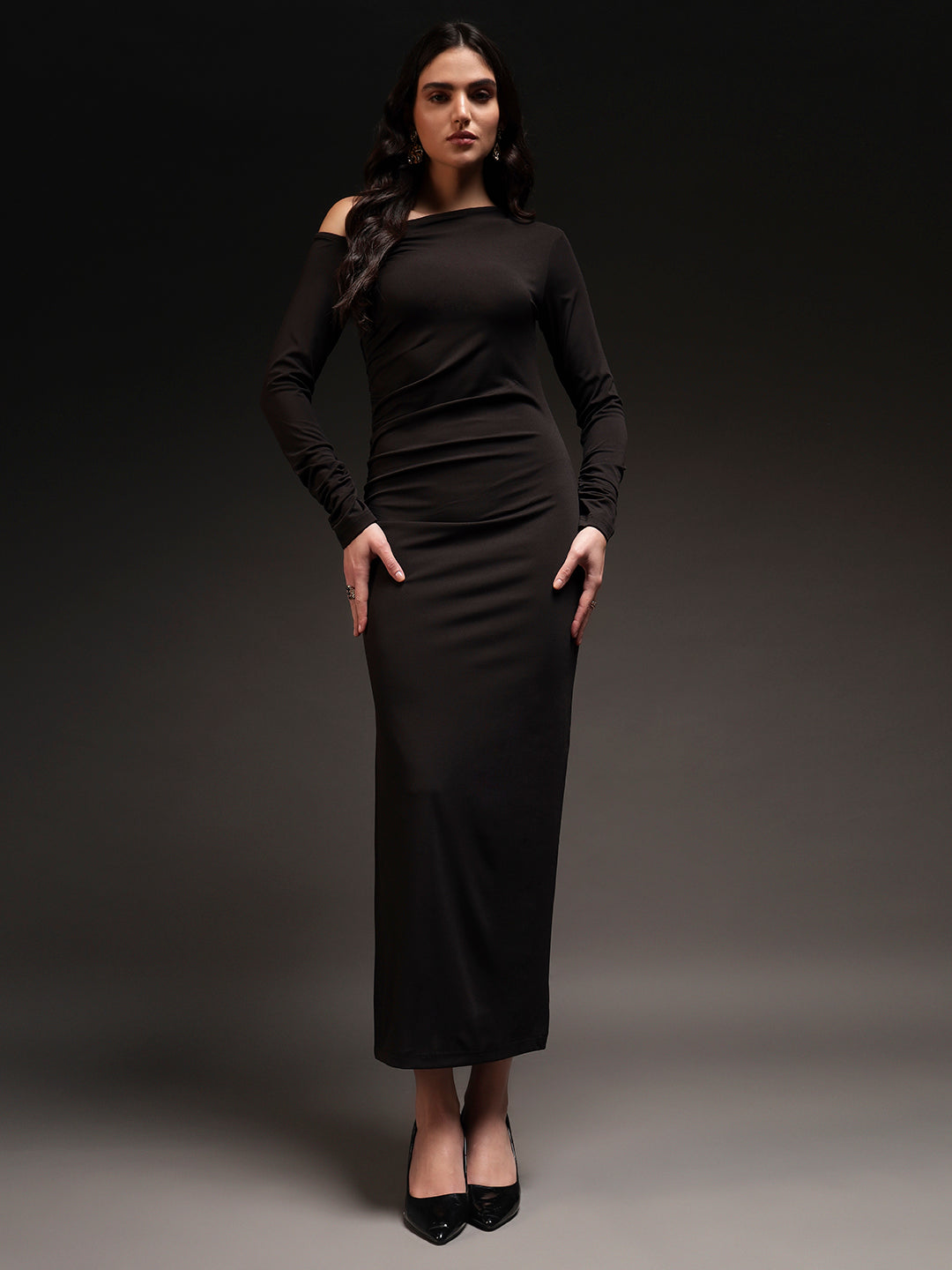 Make an Entrance with Style & Grace! Step out confidently in this showstopping black one-shoulder maxi dress. Crafted in premium rayon for a luxurious feel, this bodycon silhouette gently contours the figure, while ruching adds chic dimension and visual appeal. The dramatic asymmetric neckline and long statement sleeve elevate your party or formal event look.