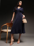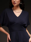 ?? Modern Elegance for Any Event! Step out in style with this navy blue flared midi dress. Featuring a sophisticated V-neckline and kimono-inspired short sleeves, this dress is both comfortable and fashion-forward. The flowy fit & flare silhouette in premium rayon skims the body gracefully and ensures you feel confident at every special moment.