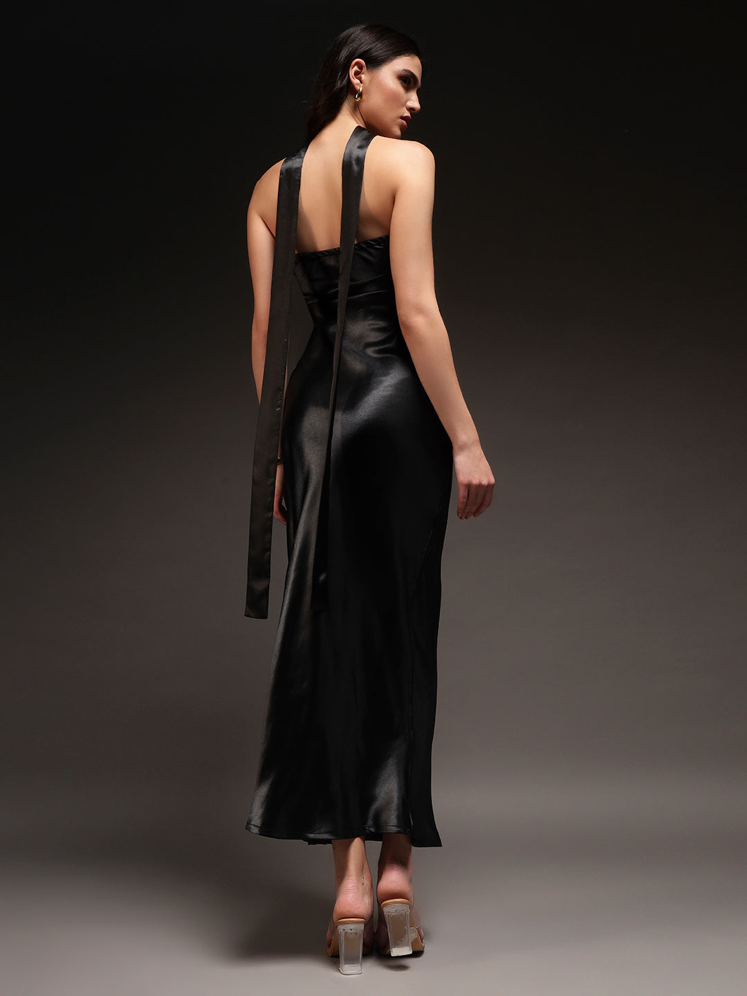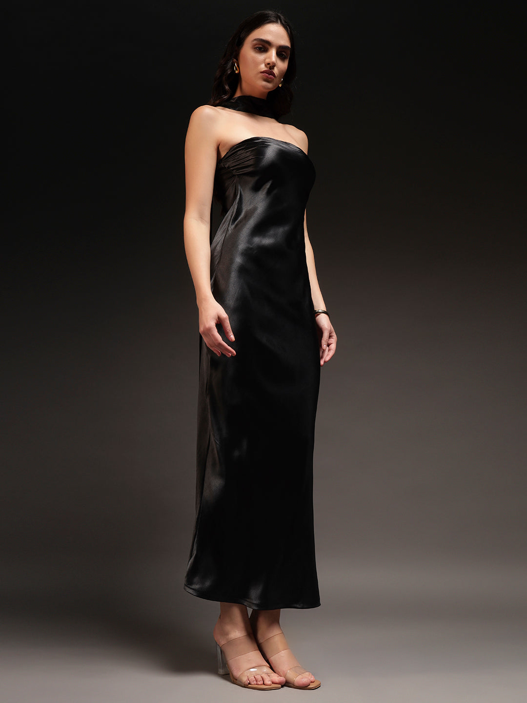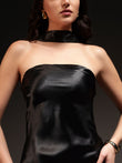 ? Shine Bright in Timeless Elegance! Step into the spotlight with this breathtaking black satin strapless maxi dress. The silky satin finish and curve-hugging silhouette exude luxury and sophistication, making it perfect for formal evenings and gala events. A dramatic tie neck detail enhances the couture-inspired look, while the floor-length design gives stunning presence.