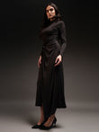 ?? Command Attention In This Artistic Statement! Unleash high drama with this black draped asymmetrical maxi dress. The metallic accent at the waist and asymmetrical layered hem create standout movement and visual intrigue. A high neck and long fitted sleeves bring timeless class and comfort, perfect for any formal event.