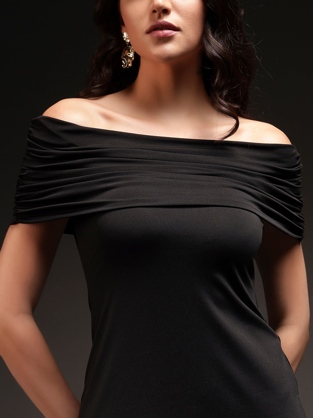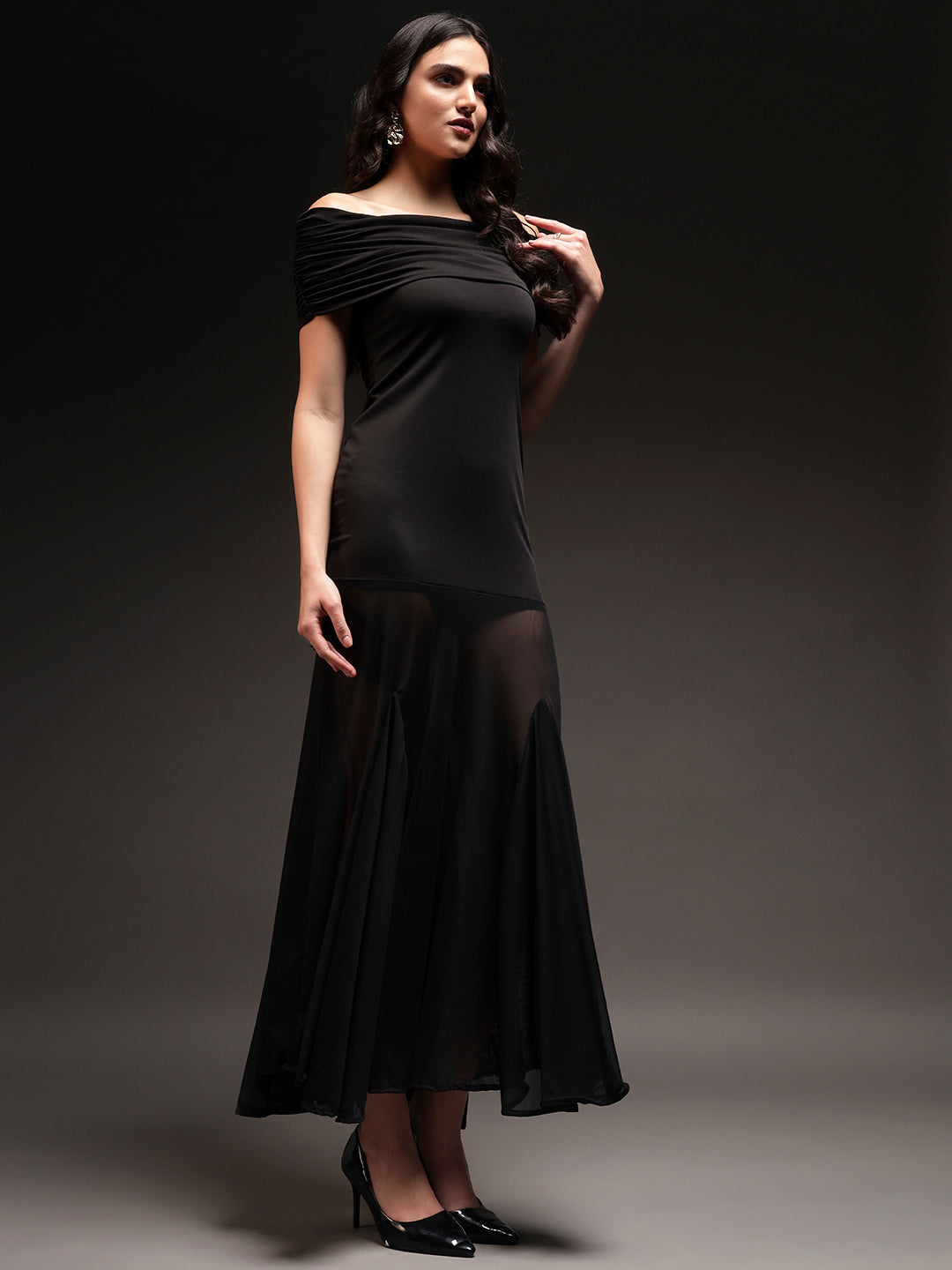 ? Glamour In Motion For Special Nights! Step into sophistication with this black off-shoulder sheer maxi dress. The ruched neckline flatters and highlights your shoulders, while the sheer layered skirt creates stunning movement and elegance. Tailored for a smooth silhouette, this dress combines luxury and comfort for all your formal occasions.