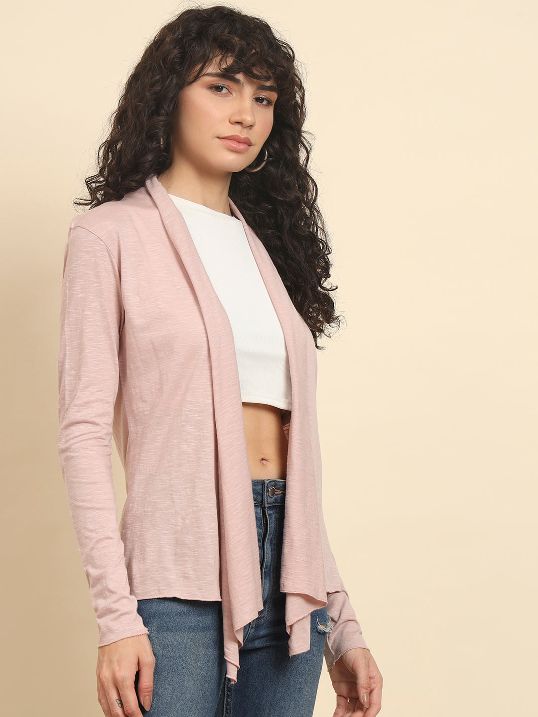 This Peach Shrug from Trend Arrest features flared style hem. The Style And Comfort Of This Stunning Set Makes It A Must-Have In Your Wardrobe. Team This With A basic top And Statement Earrings For Your Perfect Outfit.