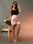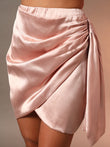 The pink satin draped skirt exudes elegance with its luxurious fabric, soft sheen, and graceful draping. Its flattering flow adds movement, making it perfect for formal events or evening occasions.
