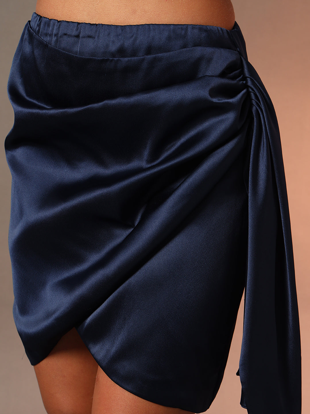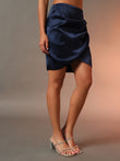The navy satin draped skirt combines elegance and sophistication, featuring soft, lustrous fabric that gracefully drapes over the body. Its timeless colour and flowy design make it perfect for evening events.
