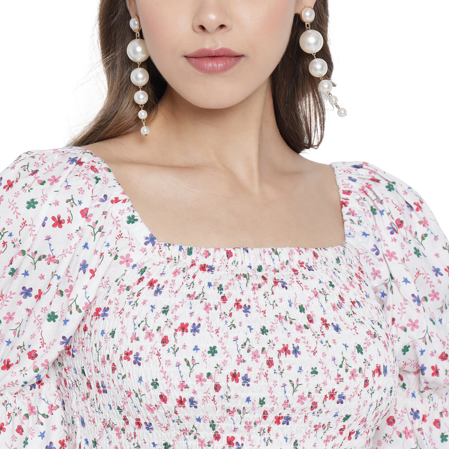 The White Floral Smoking Top features a sophisticated smocked design that contours the body for a comfortable yet flattering fit. Its delicate floral pattern on a crisp white background adds a fresh, elegant touch, making it ideal for both casual and dressier occasions. This versatile top pairs effortlessly with jeans or skirts, offering a refined balance of style and comfort for your wardrobe.