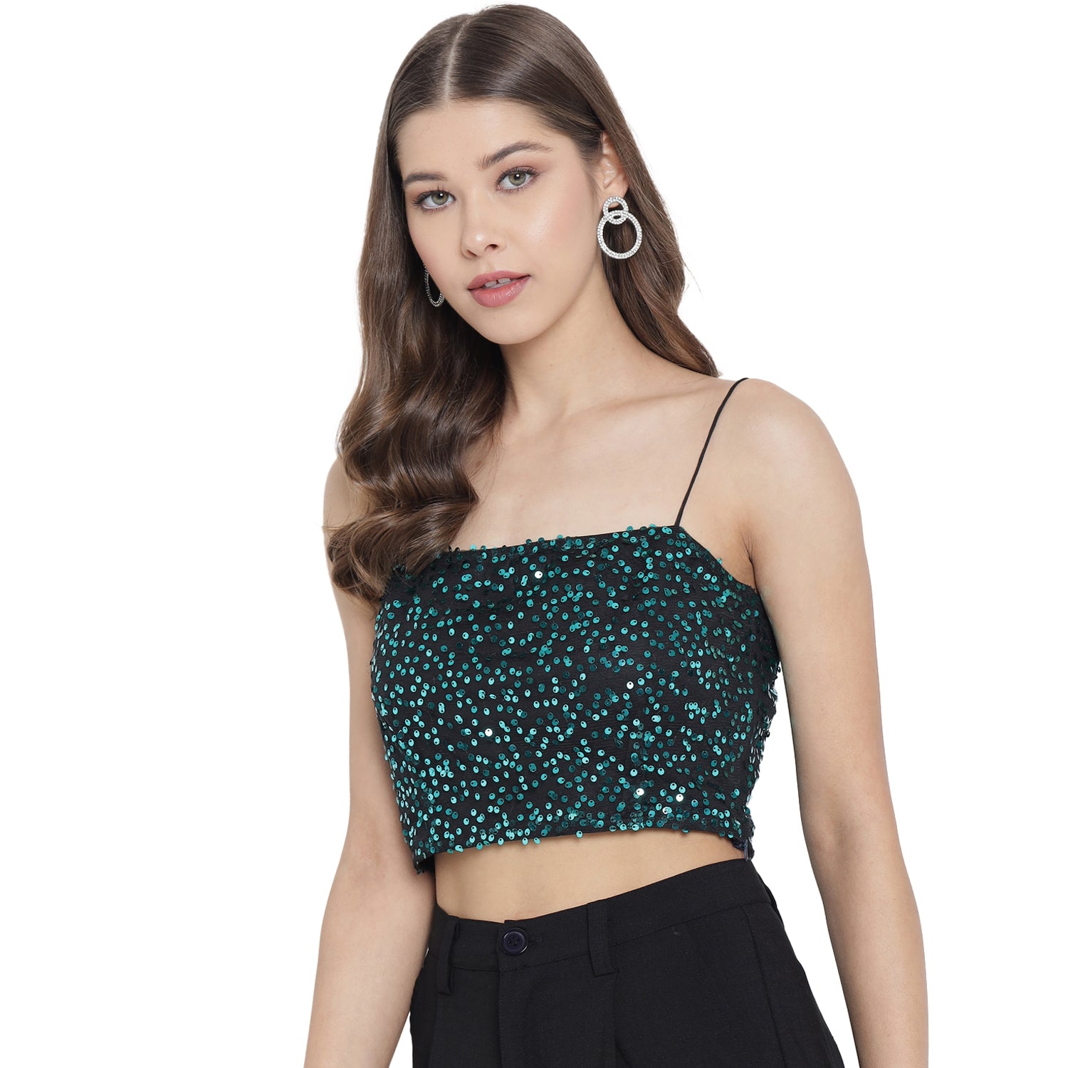 Elevate your wardrobe with the Green Sequence Crop Top, expertly crafted to combine style and comfort. Featuring intricate sequin detailing, this crop top adds a subtle shimmer, perfect for both casual outings and festive occasions. It's tailored fit enhances your silhouette while the breathable fabric ensures all-day comfort. Ideal for pairing with high-waisted bottoms, this piece offers a versatile and chic addition to any fashion-forward collection.