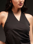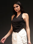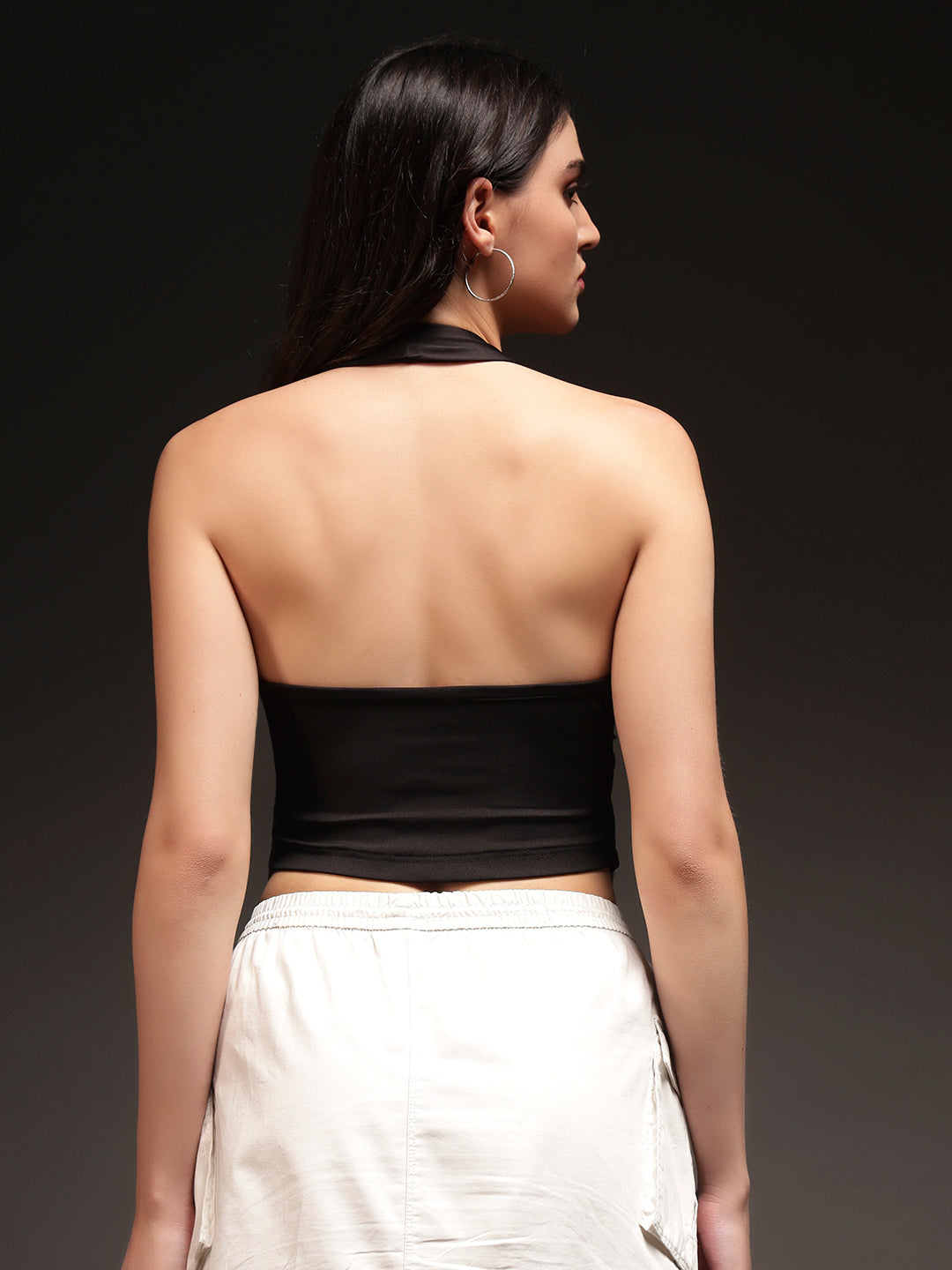 ?? Modern Party Essential With an Edge! Make every look pop with this black halter neck crop top. The criss-cross neckline adds runway flair, while side ruching and an asymmetric hem hug your curves for a flattering, trend-forward silhouette. Crafted from soft stretch fabric, it’s comfy enough for day parties and bold enough for night outs.