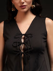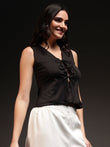 ?? Turn Heads With Bold Lace Detailing! This black lace-up front sleeveless top layers confidence and comfort with a fitted peplum cut and striking lace front ties. Sleek, stretch fabric and a flared hem give feminine ease, while the deep V-neck and edgy lacing elevate your look for work or party hours.