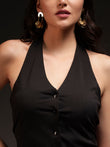 ?? Elevate Your Look With Modern Tailored Edge! This black halter neck waistcoat top is the ultimate statement piece for day or night. A deep V halter neckline and open back create a bold, flattering look, while the structured button front and pointed hem keep things tailored and unique. Comfy stretch fabric ensures you stay confident at every event.